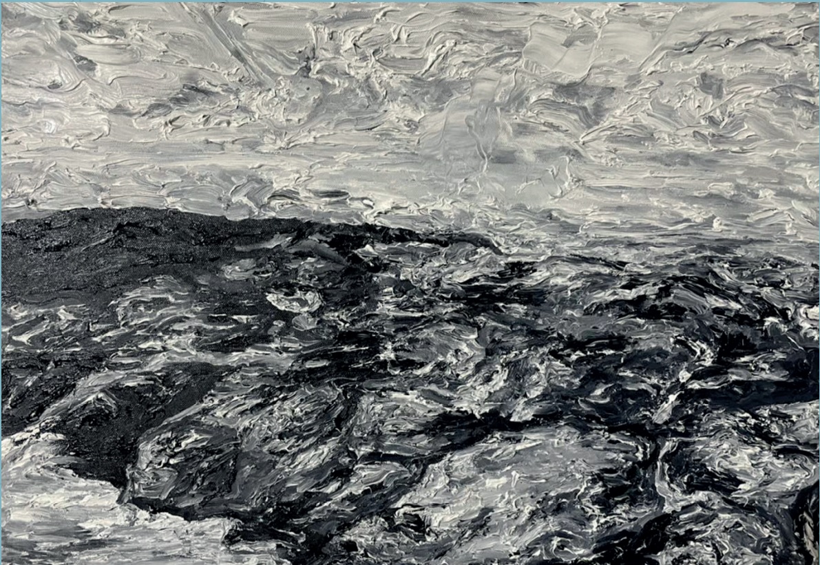 我嘗試把水墨畫的概念帶入油畫,而探討如何利用黑白的顏料讓作品有半浮雕的質感。