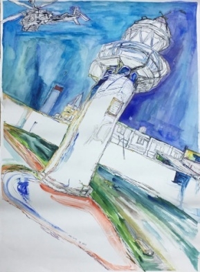 在七美燈塔遊玩時,看到四面潔白如玉的牆壁以及燈塔;讓我想到水墨畫中的留白技巧,雖然我不擅長畫水墨;但還是想嘗試以水彩的西畫方式跟國畫相結合。用類似鋼筆線條的方式畫出陽光照射在燈塔牆體的陰影以及牆面上的紋路。捨棄多餘的色彩,用純淨的藍與綠來展現被世人遺忘的一隅。